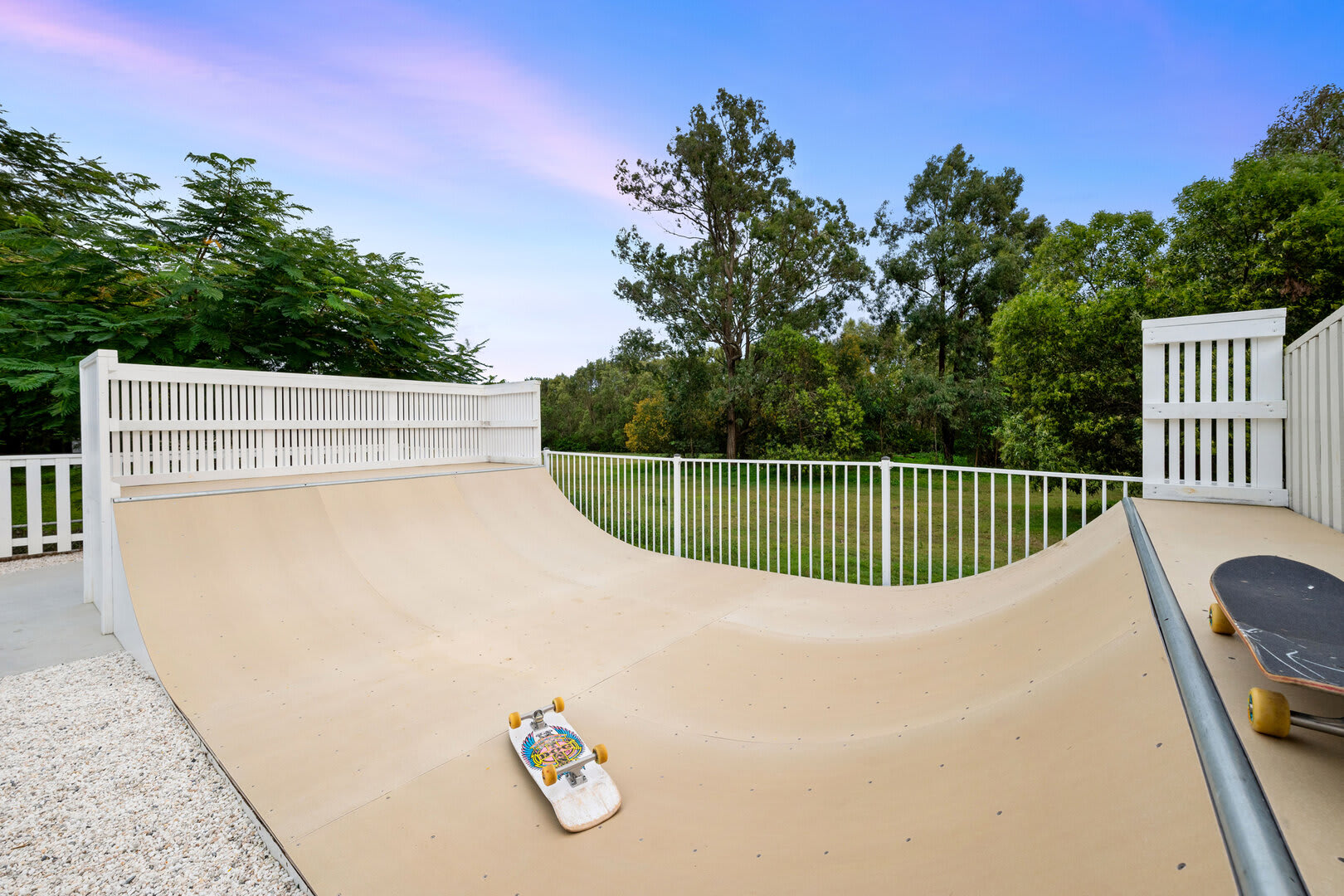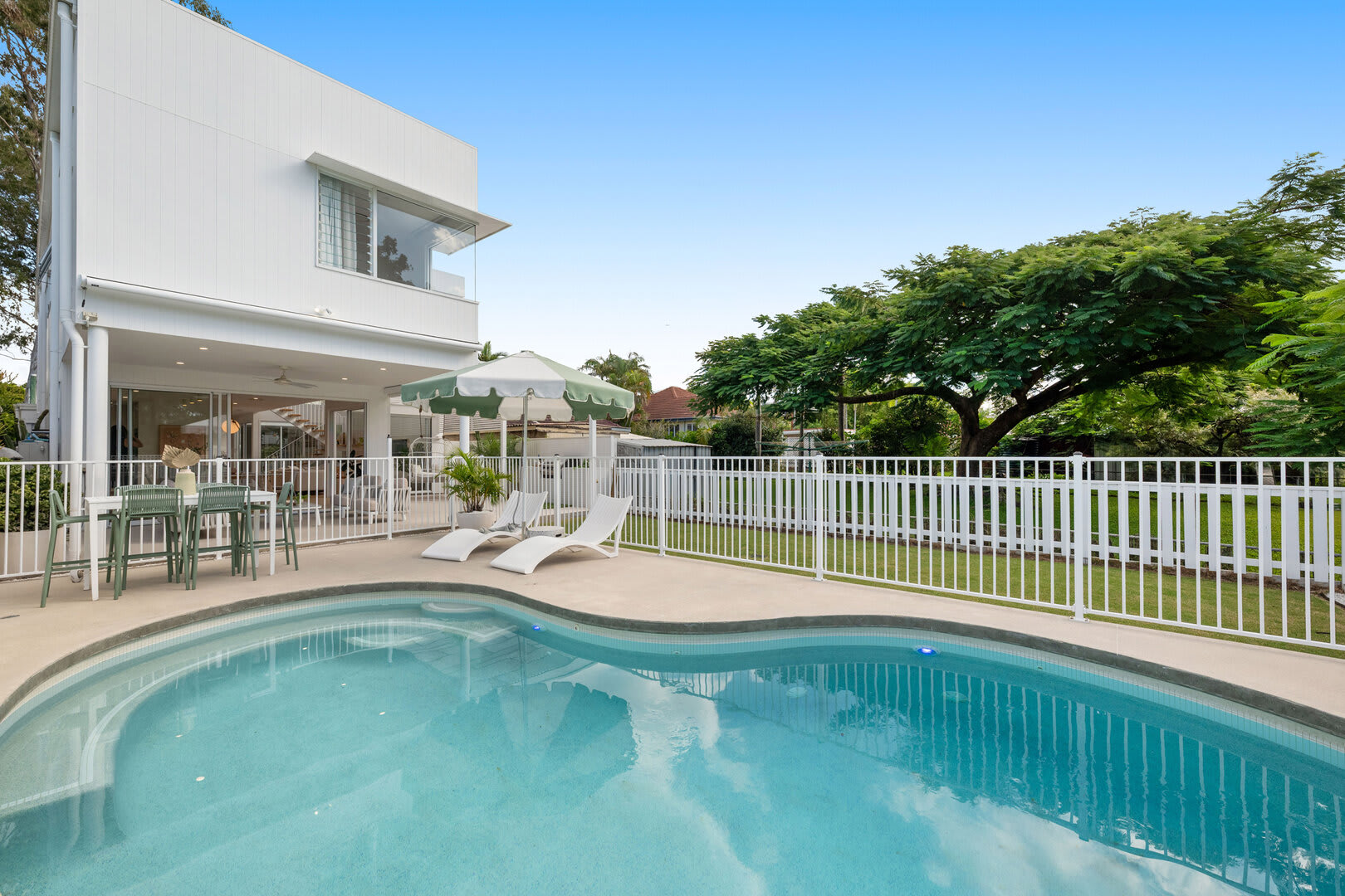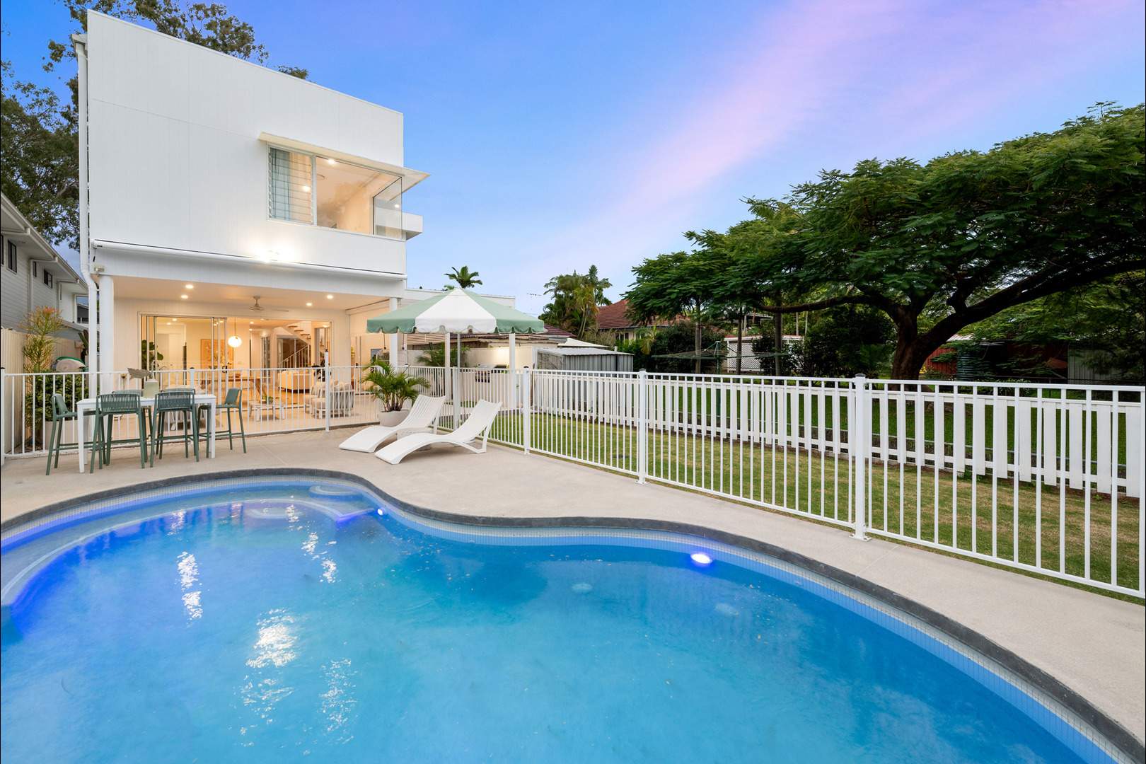 This airy 5-bed home is perfect for families with a love of natural light and modern design features. A truly stunning designer home, complete with a back yard that’s perfect for an active family: it offers a pool, a skateboard ramp, a covered entertainment area, and a small lawn. It’s the ultimate home for families looking for an extended stay, or an interim home when relocating to Brisbane.
