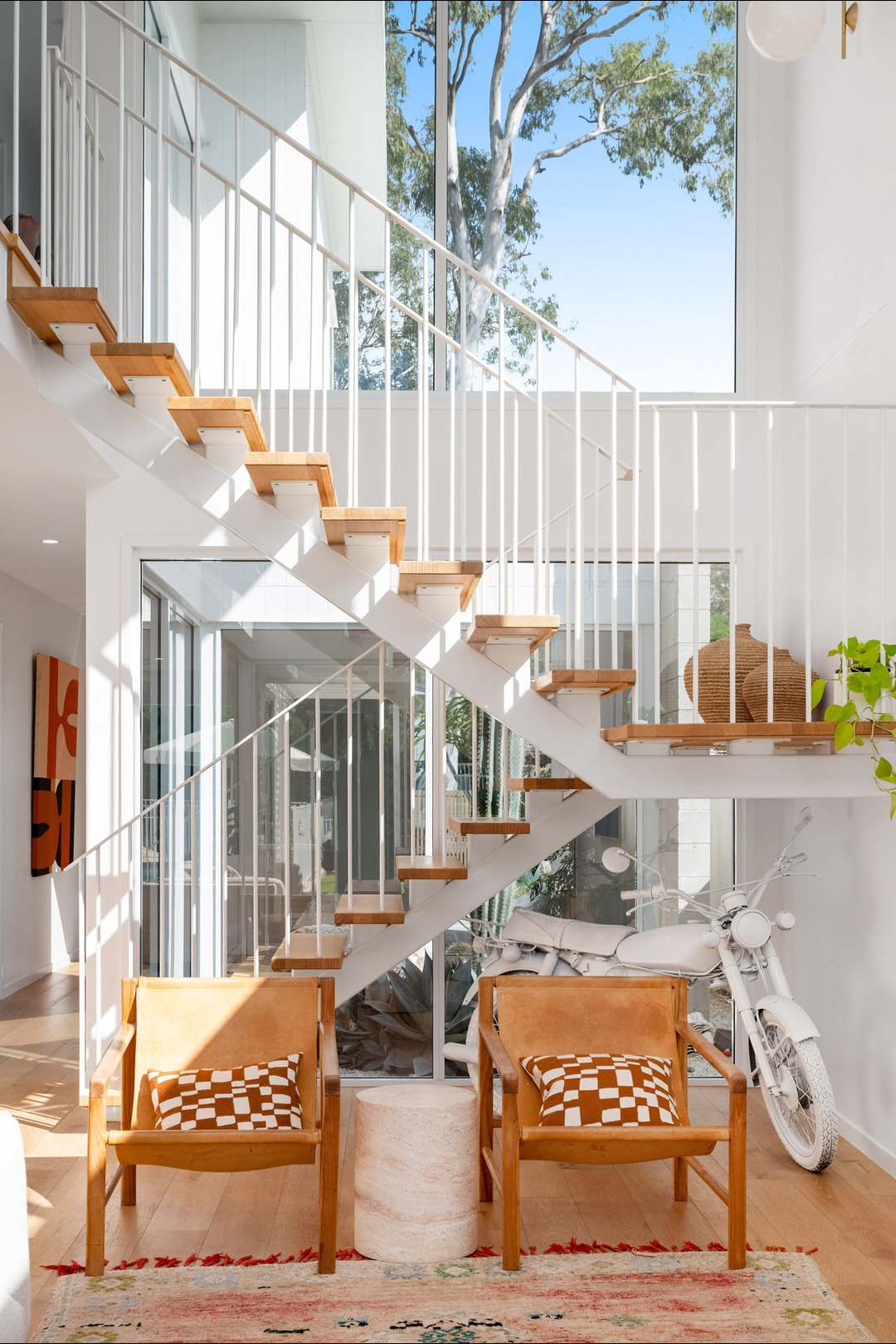 Glass walls facing the garden, an open floorplan, as well as an atrium void by the lounge ensure this gorgeous home is bathed in natural light. The minimalist decor and white interiors further add to the feeling of airiness. Designer touches, like a floating staircase, make this home truly unique.