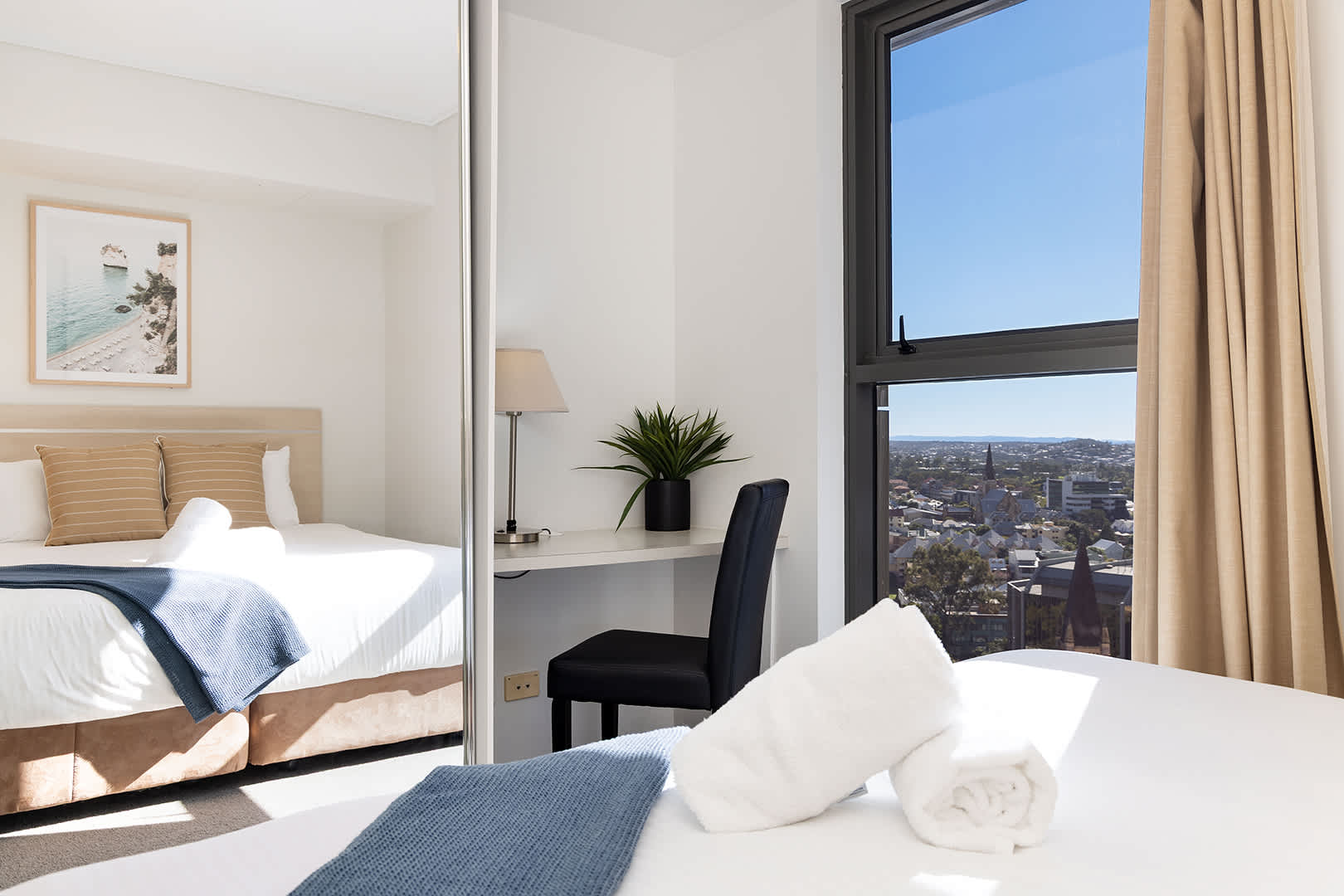 This modern and recently refurnished two-bed, two-bath apartment in a gorgeous high-rise offers incredible river and city views. It is surprisingly spacious and offers everything you could ask for in a stay in Brisbane. Complete with a communal pool, spa, sauna, BBQ area, and gym, it’s the perfect base for work or extended stays in the heart of the CBD.